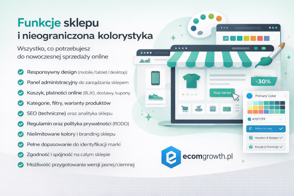 Brak miesięcznych opłat za korzystanie z platformy. Sklep należy w całości do Ciebie, a jedyne koszty to domena oraz hosting, które sam wybierasz i kontrolujesz.
